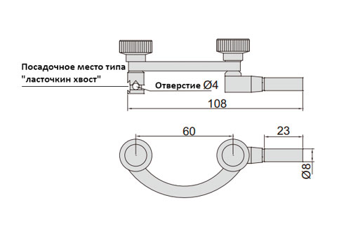 Держатель универсальный для индикаторов ИРБ. Для закрепления индикаторов в штативе с посадкой Ø 4 мм. Фиксация индикаторной головки - "ласточкин хвост".