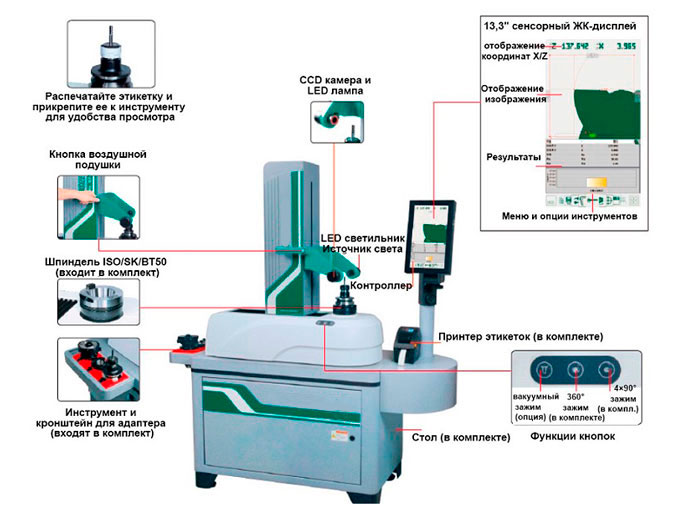 Стандартный комплект поставки: Основной блок, Контроллер, Кронштейн для инструмента и преобразователя, Шпиндель ISO/SK/BT50 (включает зажим на 360° и зажим на 4×90°) 1 шт., Принтер (1 шт.), бумага для этикеток для принтера (1 шт.).
