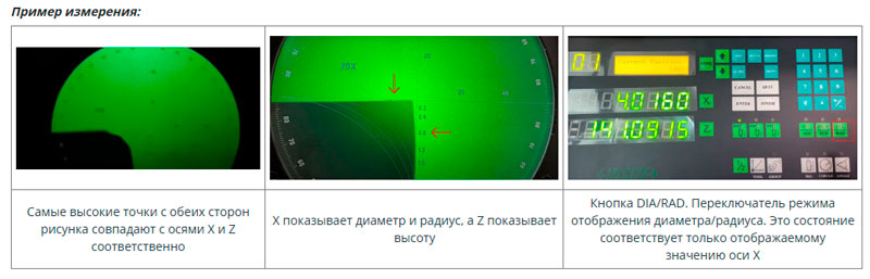 Самые высокие точки с обеих сторон рисунка совпадают с осями X и Z соответственно | X показывает диаметр и радиус, а Z показывает высоту | Кнопка DIA/RAD. Переключатель режима отображения диаметра/радиуса. Это состояние соответствует только отображаемому значению оси X |