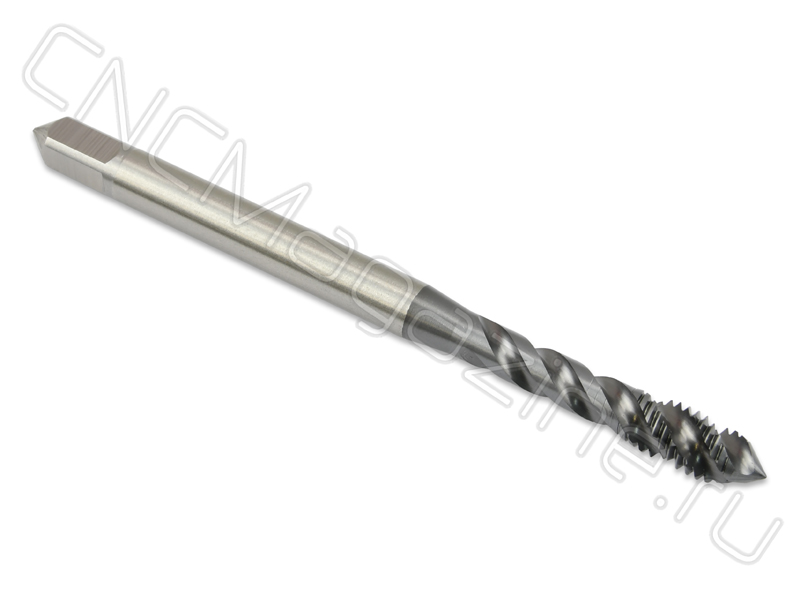 Многофункциональный универсальный машинный метчик из быстрорежущей попрошковой стали HSSE-PM со спиральной стружечной канавкой. С покрытием TiCN. Для глухих отверстий. Угол спирали фрезы 45 градусов.