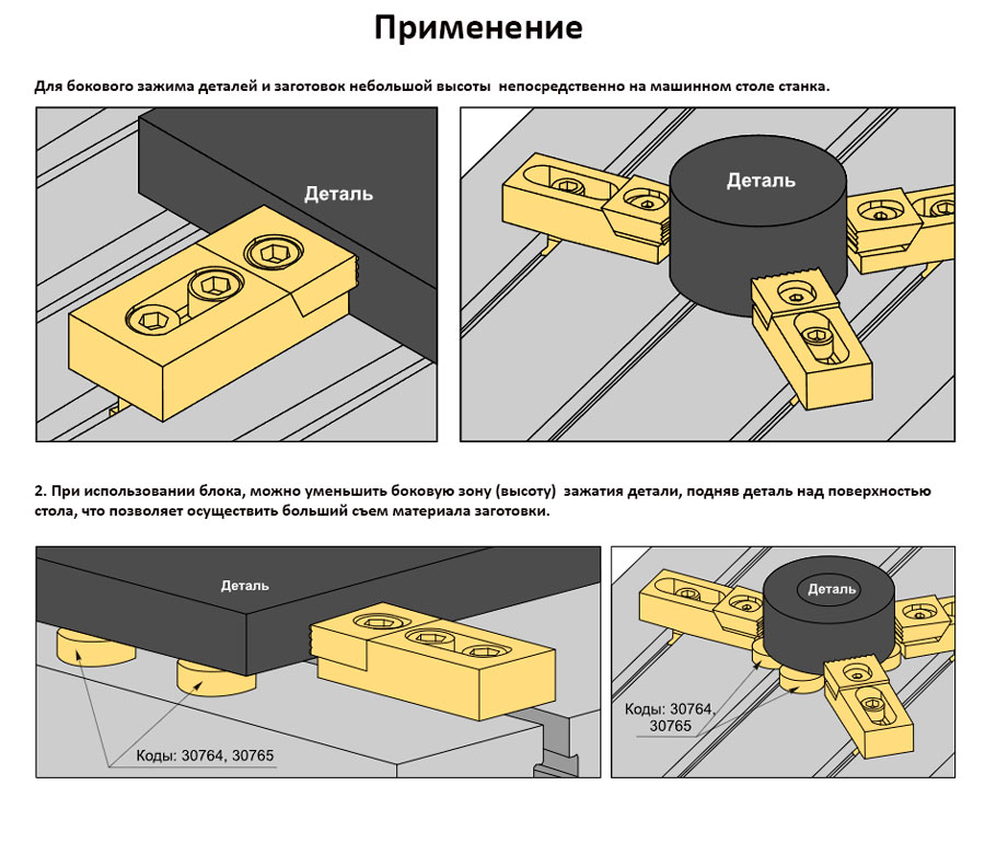 - При использовании блока (параллельный круглый, код: 30764, 30765 и др.), можно уменьшить боковую зону (высоту) зажатия детали, подняв деталь над поверхностью стола, что позволяет осуществить больший съем материала заготовки.