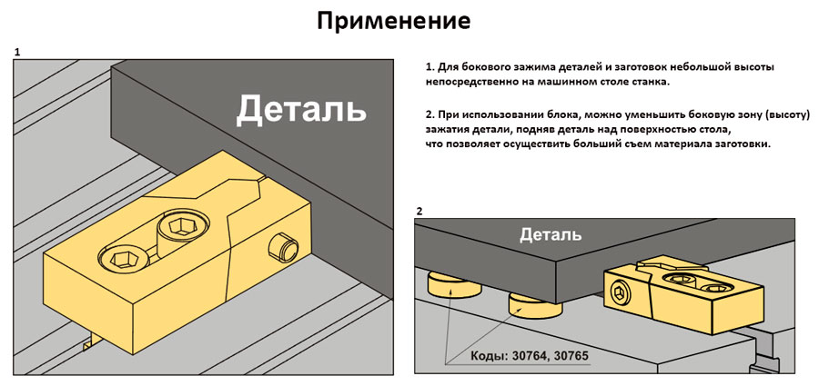 - При использовании блока (параллельный круглый, код: 30764, 30765), можно уменьшить боковую зону (высоту) зажатия детали, подняв деталь над поверхностью стола, что позволяет осуществить больший съем материала заготовки.
