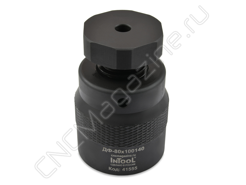 Домкрат (регулируемая подпорка) с плоской опорной поверхностью изготовлен из закаленной стали, с воронением. Трапецеидальная резьба винта самотормозящая Tr40x6, концевой предохранитель. Hmin 100 мм, Hmax 140 мм. Диаметр оснастки 77 мм. Диаметр отверстия на плоском торце винта 12 мм, для установки дополнительных аксессуаров.