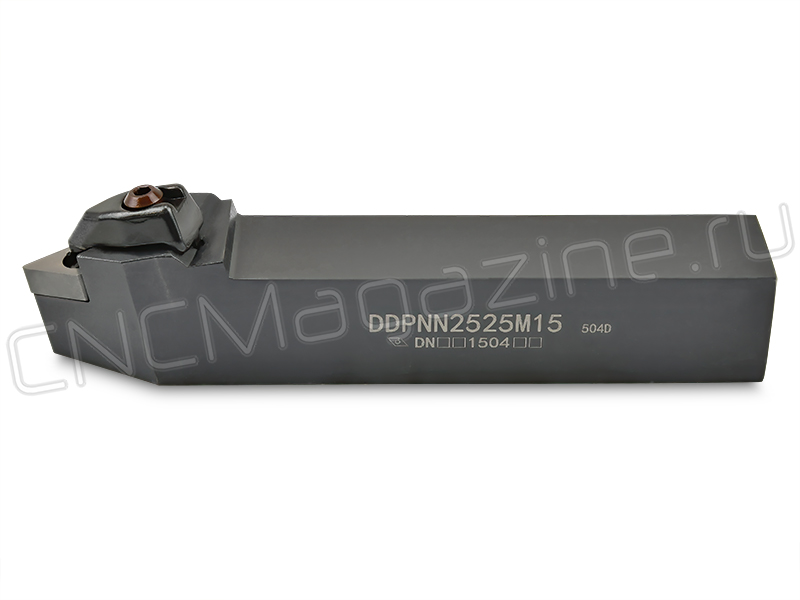 Резец токарный для наружного точения по металлу со сменными пластинами. Для пластин DN**1504**. Державка токарная с креплением типа D (двойной прижим кронштейном). С углом в плане 62.5°. Для обработки по контуру.