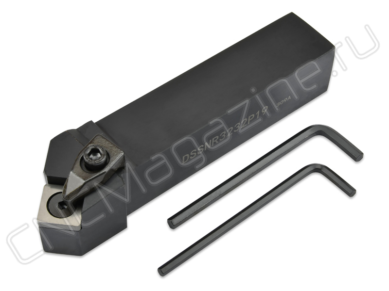 Резец токарный для наружного точения по металлу со сменными пластинами. Для пластин SN**1906**. Державка токарная с креплением типа D (двойной прижим кронштейном). С углом в плане 45°. Для продольного точения и подрезки торца.