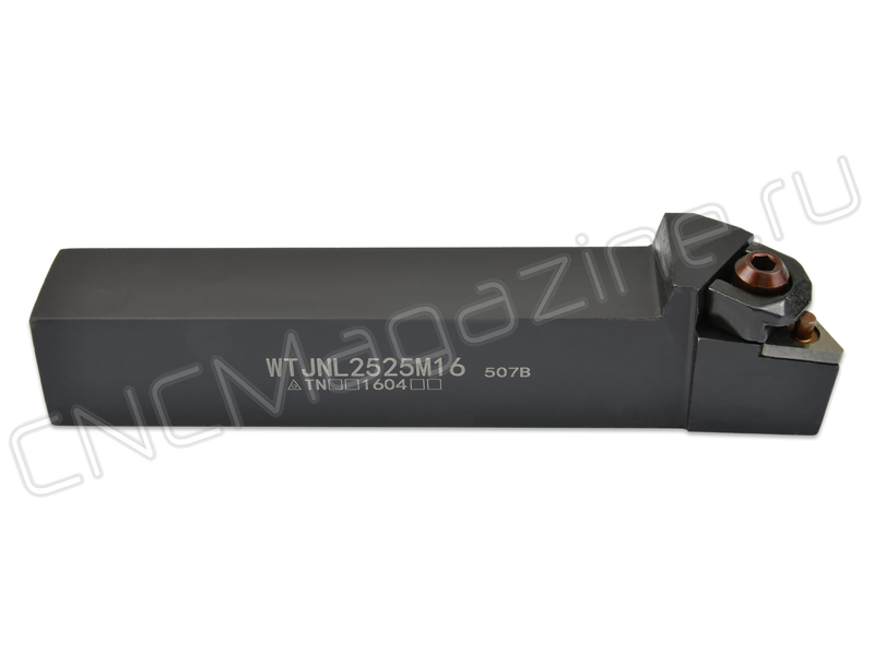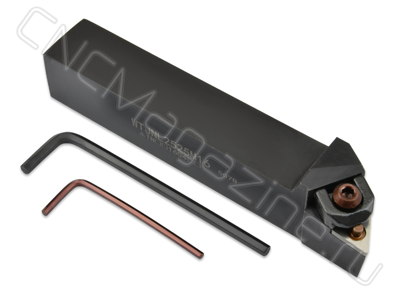 Резец токарный для наружного точения по металлу со сменными пластинами. Для пластин TN**1604**. Державка токарная типа W (прижим клин-прихватом на штифте). С углом в плане 93°.